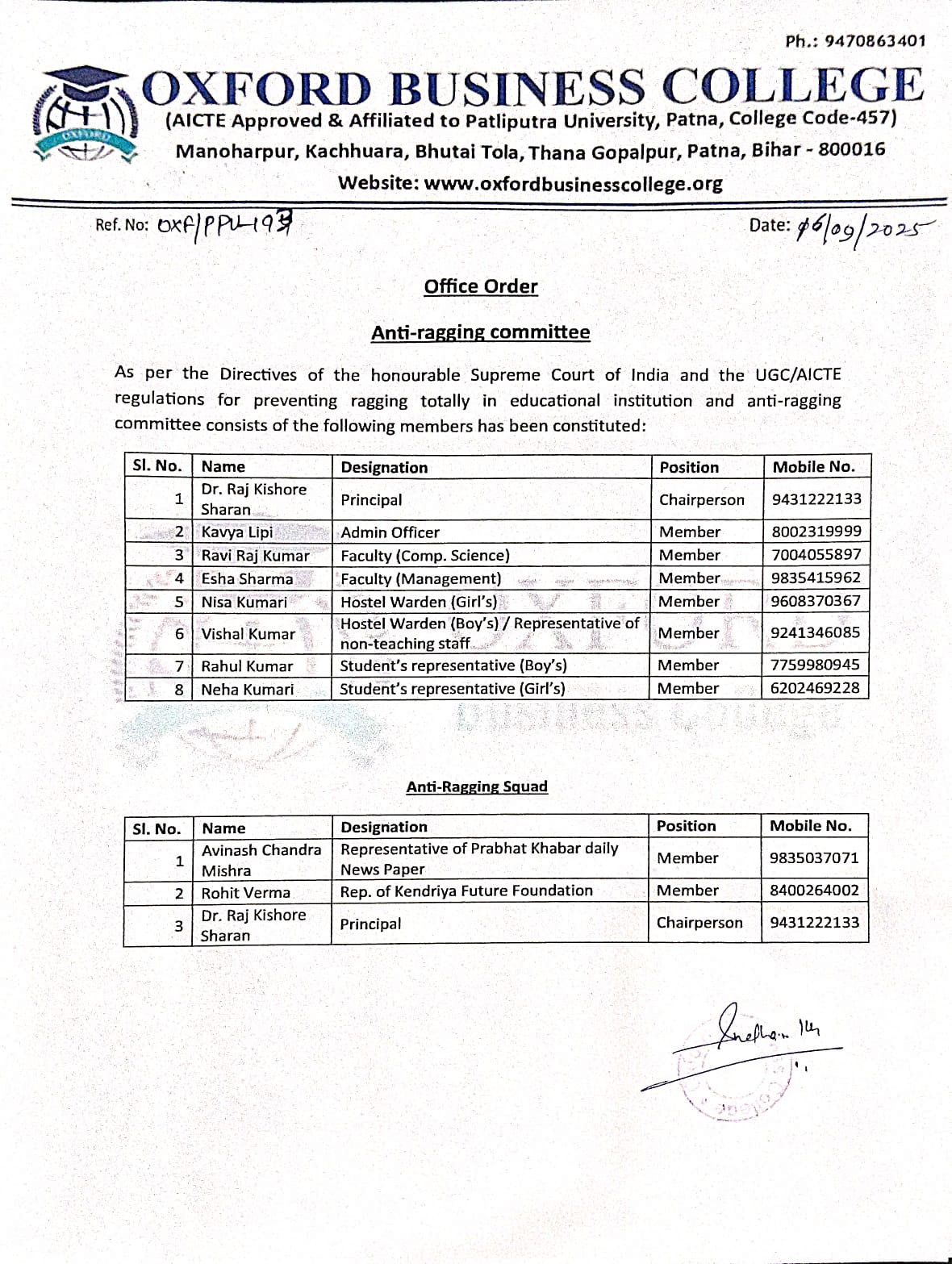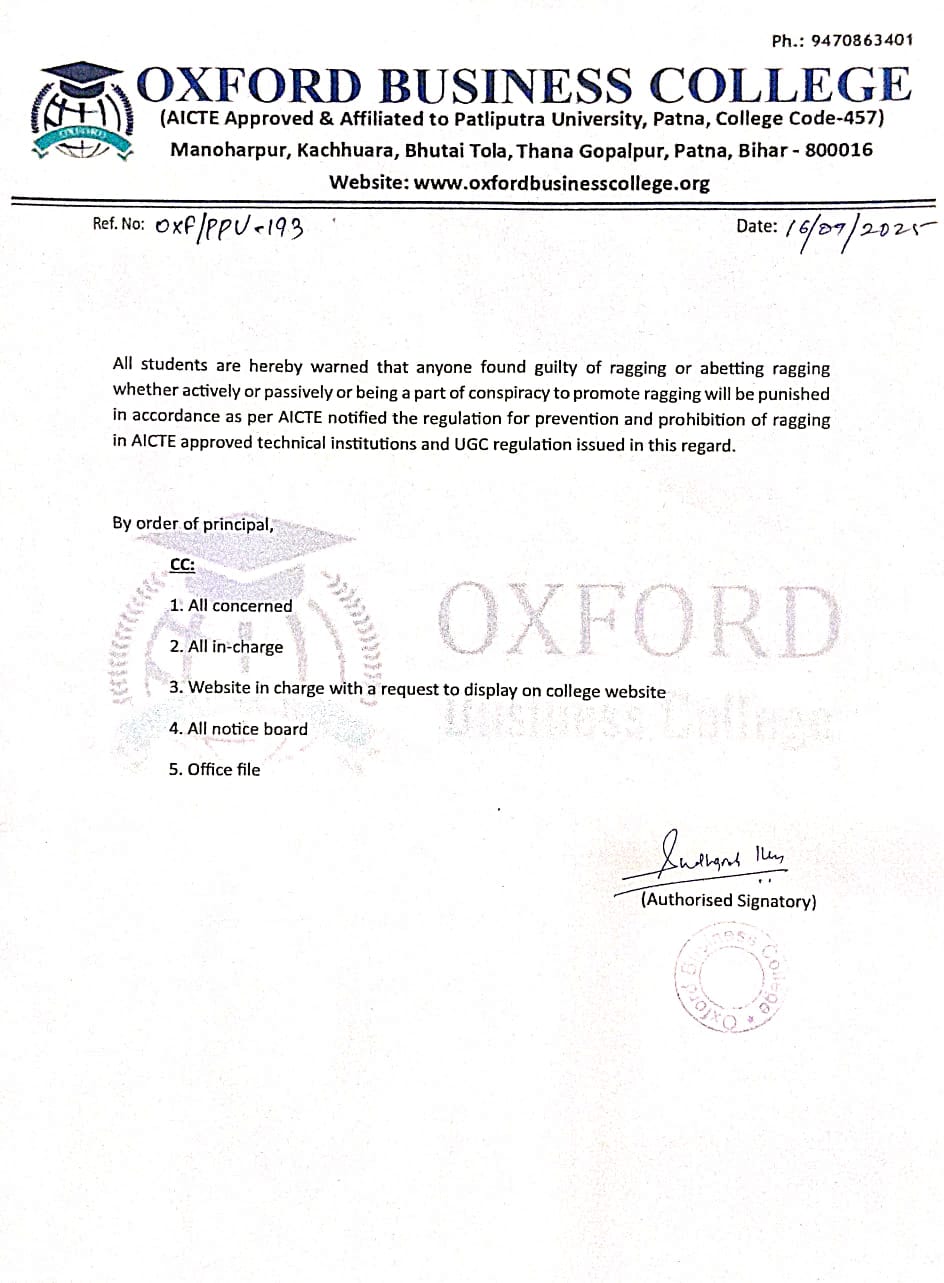 This is an important notice to all students of Oxford Business College, Patna. It is mandatory for every student to understand that any involvement in ragging, whether active or passive, or being complicit in promoting or abetting ragging, will lead to strict and severe action.